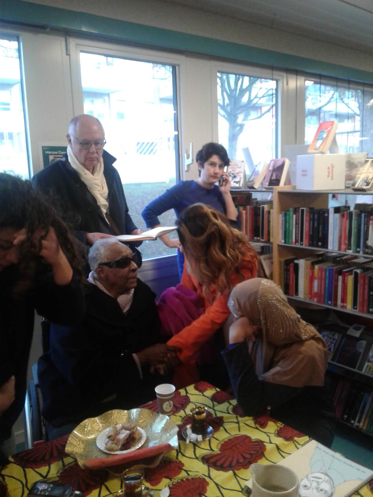 Así pues, Condé llegó a la Biblioteca a las diez de la mañana en silla de ruedas, vestida con ropa oscura, con un sombrero color café chocolate, lentes oscuros y en compañía de su esposo y traductor Richard Philcox. Se acomodaron en primera fila, acto seguido los alumnos del Colegio Askeby entraron en fila de dos en dos, vestidos de blanco y con velas en las manos, entonando canciones navideñas. Luego los estudiantes del Colegio de Rinkeby le dieron la bienvenida en diferentes idiomas. Ionesco Ionut-Catalin y Rania Hassoni fueron los maestros de ceremonia y dirigiéndose a la galardonada anunciaron: “Bienvenida a Suecia, a Estocolmo y a la Biblioteca de Rinkeby. Para nosotros es un honor compartir estos gratos momentos con usted. Hemos elaborado dos folletos, uno acerca del Premio Nobel y otro sobre su vida. Tenemos 14 años y estudiamos en el Colegio de Rinkeby. En Rinkeby viven 16000 personas y ese nombre significa guerrero. Rinkeby es un lugar muy antiguo, pero el Rinkeby moderno se inauguró, el 3 de noviembre de 1971. En este sector vive gente de todo el mundo: de África, de Asia, de Sudamérica y de otros países europeos. Existen desventajas y problemas en esta parte de Estocolmo. No obstante, somos alegres y nos sentimos bien”.